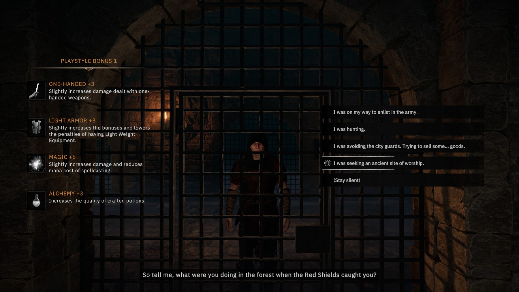 Văzând și ceva statui cu iz prometean, mi-am zis pe loc că e rost de niște aventuri antediluviene. M-am trezit începând Tainted Grail din eponimica închisoare bethesdiană, ca un prizonier tabula rasa, luat la întrebări generatoare de personaj de un gardian ursuz. Suntem bineînțeles eliberați de un salvator misterios, ce ne lasă să scăpăm singuri în chip de probă, simțindu-ne mai mult că sunt luați peste picior decât ca un mesia redescoperit.