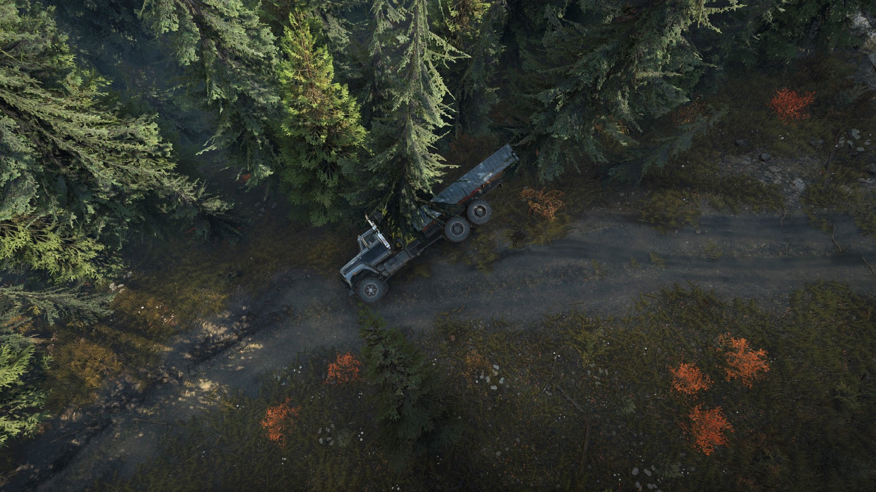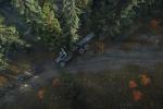 Însă giumbușlucuri de-astea poți face doar când traseul îți permite. În general în SnowRunner n-ai parte de șosele lungi și drepte, ci mai degrabă de drumuri noroioase și întortocheate pe teren denivelat, iar când mergi prin păduri există în permanență riscul ca un element al convoiului să se agațe de vreo creangă sau să se împiedice de vreun ciot și să ramână blocat acolo sau, mai grav, să se răstoarne cumva și să pierzi toată încărcătura.